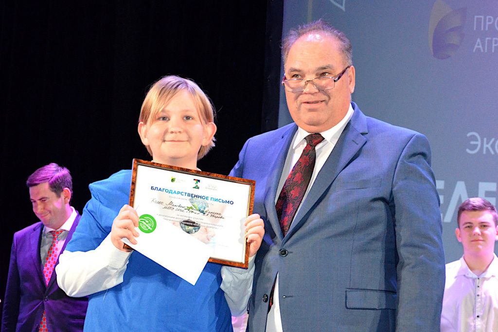 Генеральный директор группы кампаний «Прогресс Агро» Леонид Рагозин вручил специальный приз Матвею Колосу — ученику 6-го класса школы №14 станицы Тенгинской.