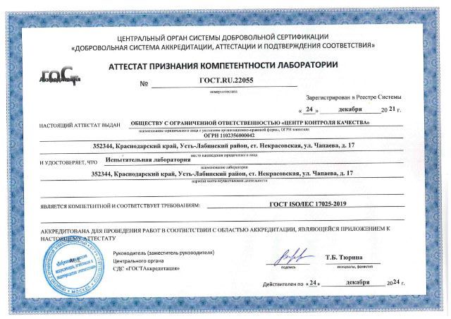 Испытательная лаборатория ООО «Центр контроля качества» прошла процедуру аккредитации и получила аттестат признания компетентности лаборатории.