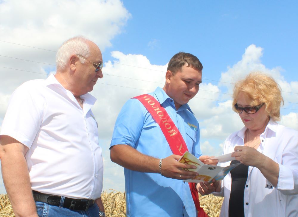 Председатель районной организации профсоюза работников АПК Тамара Попова и Председатель первичной организации профсоюза агрокомпании «Рассвет» Владимир Шевцов вручили ребятам деньги – 10 тыс. рублей, именной буклет и нагрудную красную ленту «Молодой хлебороб».