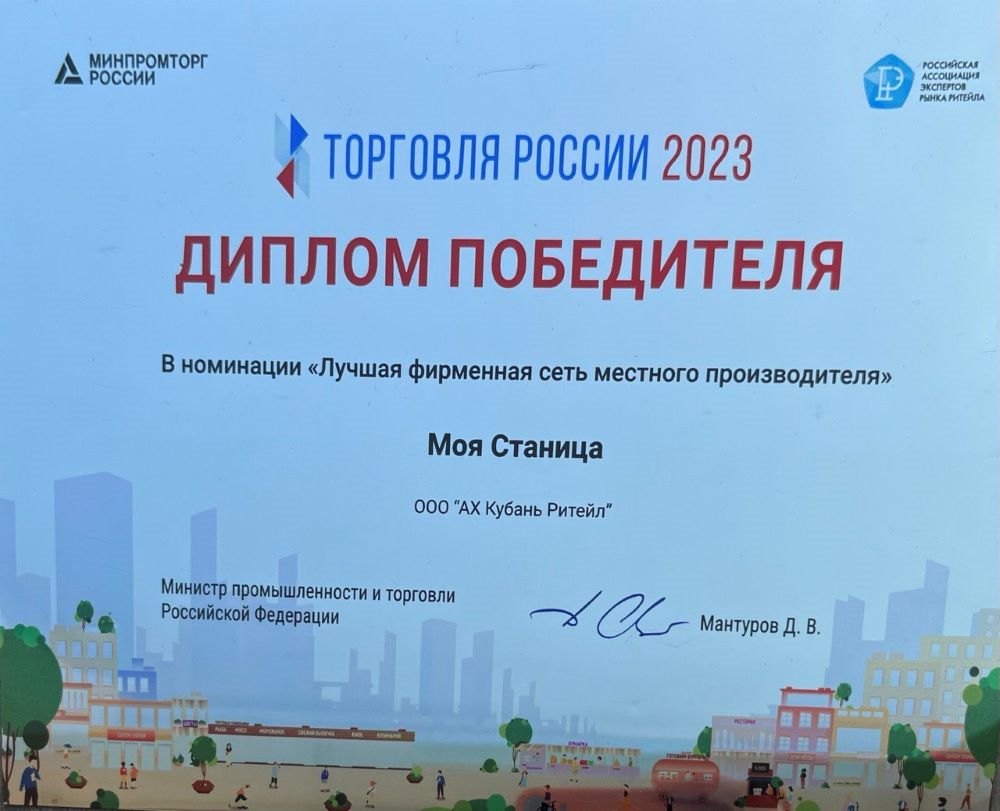 Сеть усть-лабинских магазинов «Моя Станица» награждена в номинации «Лучшая фирменная сеть местного производителя» в престижном федеральном конкурсе «Торговля России- 2023».