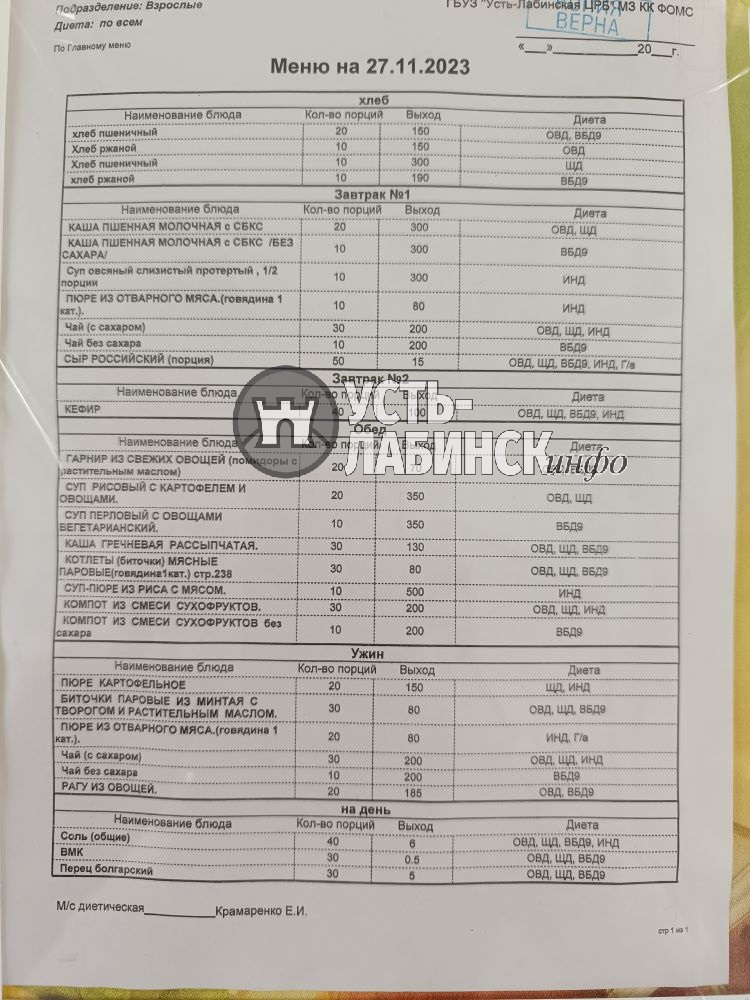 Перед уходом мы заглянули в другие отделения, искали хотя бы одного таракана специально, чтобы сфотографировать для статьи. Не нашли и передумали. Вряд ли этот "портрет" или "групповой снимок" доставил бы кому-то из читателей удовольствие. Но они все равно где-то рядом. Будем надеяться, что скоро непрошенных гостей ликвидируют, и тогда лечить и лечиться в Усть-Лабинской ЦРБ будет комфортней, и что руководство больницы обратит внимание на качество работы кого-то из поваров. В конце концов, продукты больница закупает, а пациенты остаются голодные. Хотя, судя по меню, ассортимент блюд разнообразен.