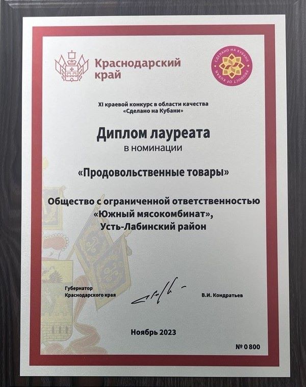Диплом лауреата XI краевого конкурса качества «Сделано на Кубани» в номинации «Продовольственные товары» получил ООО «Южный мясокомбинат».